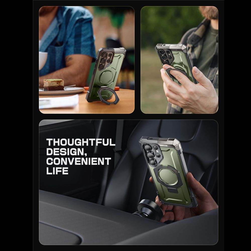 Supcase UB Grip Magsafe je ovitek, ki združuje odpornost, funkcionalnost in eleganten dizajn. Izdelan iz udarcem odpornega materiala TPU, ima ojačane vogale, ki zagotavljajo zaščito pred padci v skladu z vojaškimi standardi MIL-STD 810G (do 15 čevljev). Ovitek se ponaša z vojaškim slogom, kar napravi daje sodoben videz, hkrati pa jo ščiti pred praskami.